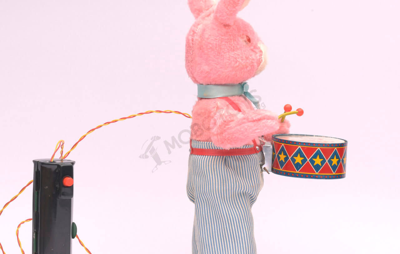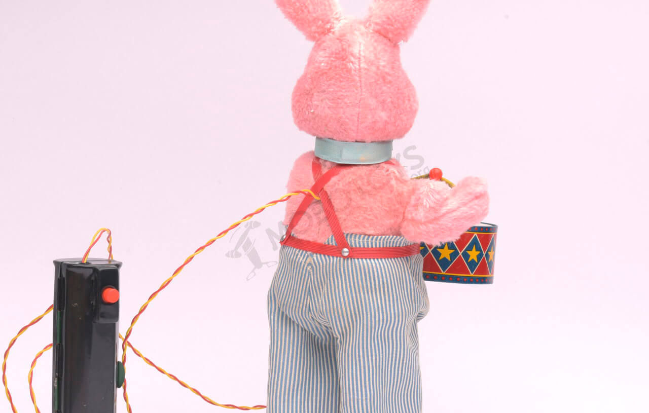Made from Tin covered with plush materials Peter the Drumming Rabbit marches forward while playing his drum. His head features lighted eyes and turns left and its all controlled by a two-battery and one-button wired remote control. The drum is hinged and folds down for storage in his colorful box which surely screamed "pick me up" from any 1950s toy store shelf.