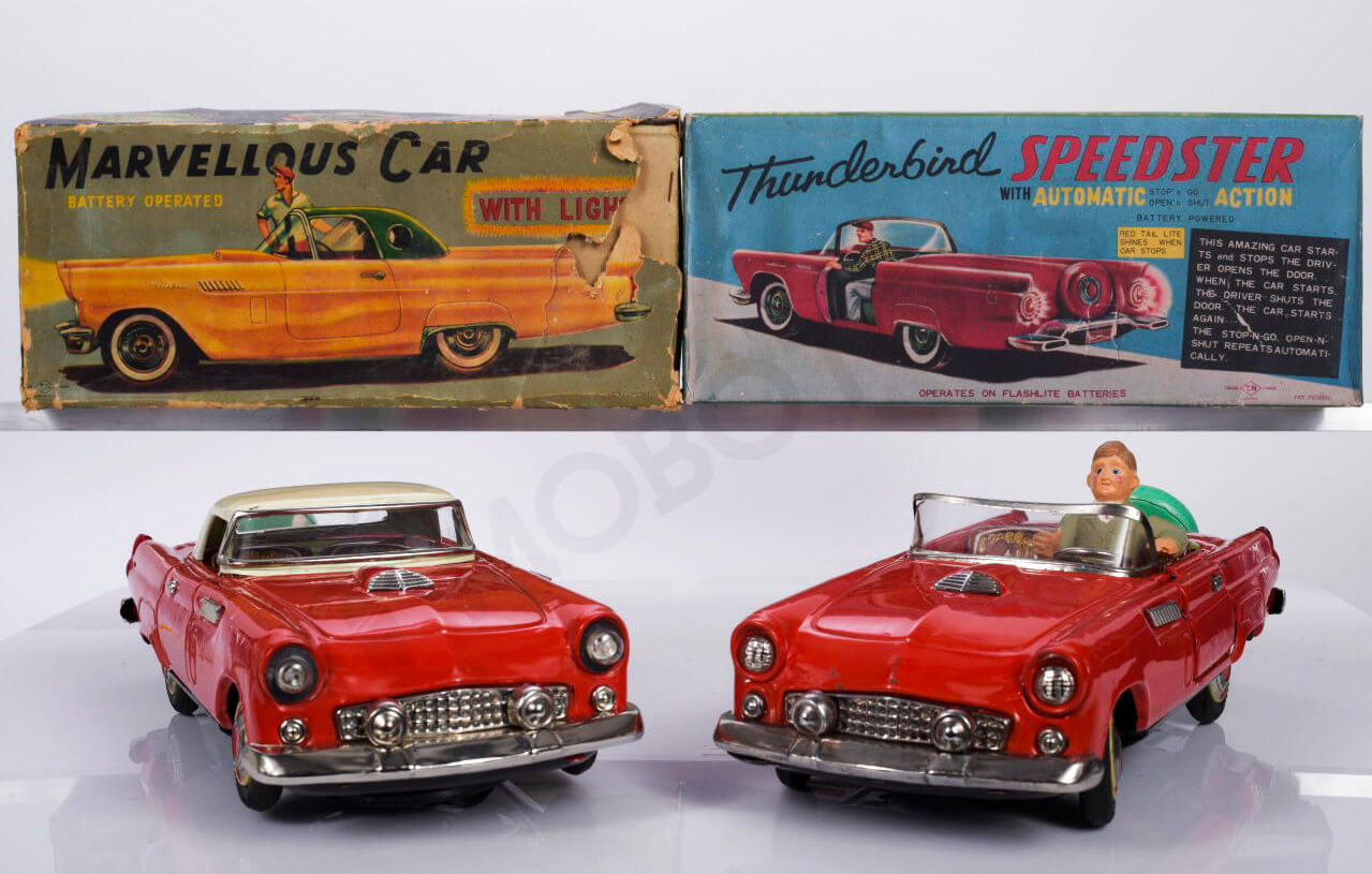 (From Box) Thunderbird Speedster with Automatic Stop & Go, Open & shut ACTION. Red tail lite shines when car stops. This amazing car starts and stops the driver opens the door when the car starts the driver shuts the door, the car starts again... the stop-n-go open-n-shut repeats automatically.