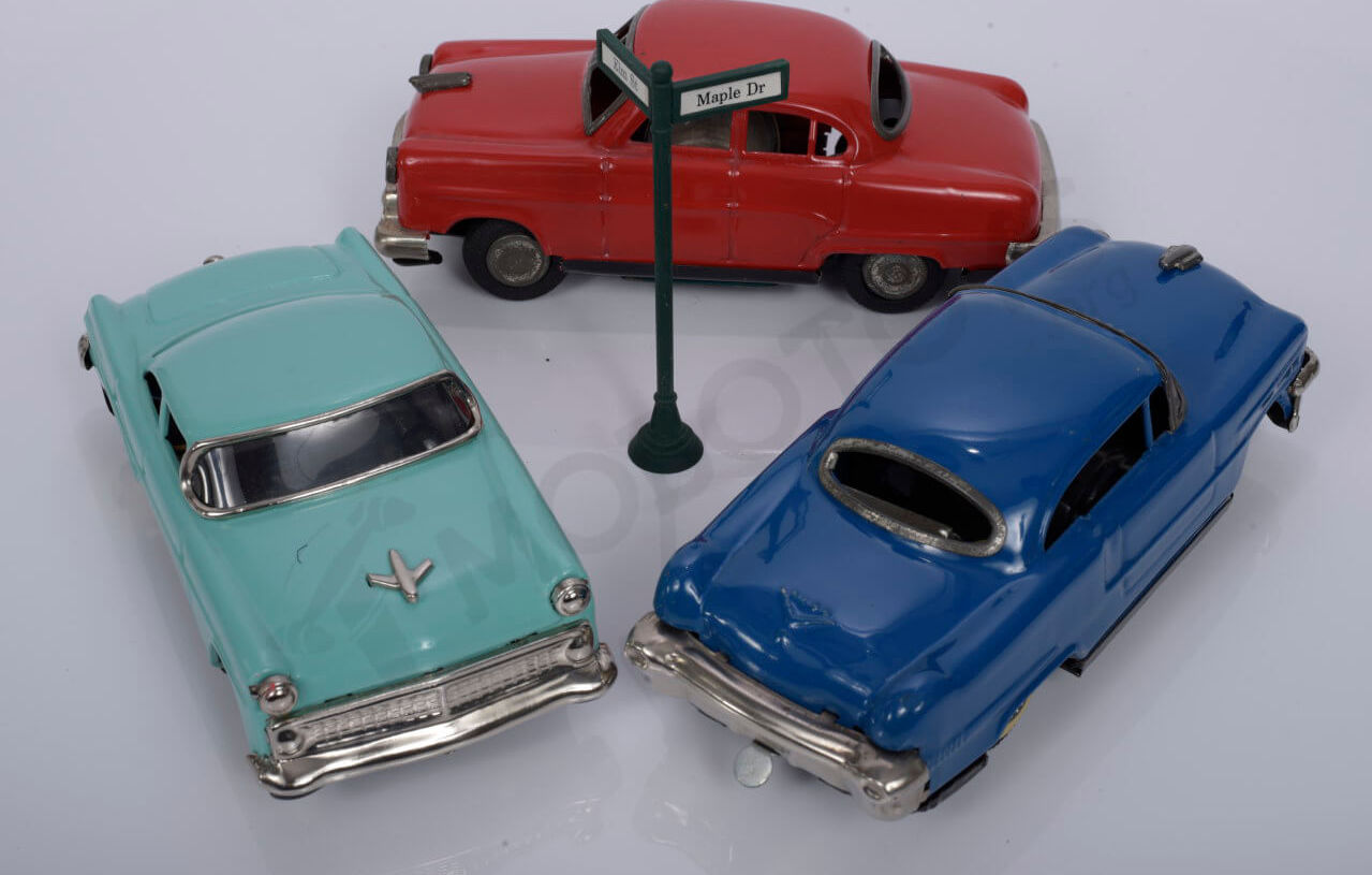 2. Dark Blue Sedan - Produced by Normura, Japan. Appears to be a 1952 Cadillac. While it only has forward motion it does include a front windshield and a very fancy front bumper for added realistic detail.
