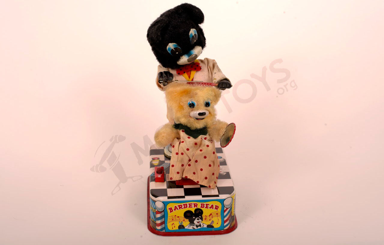 Barber Bear is an awesome "on the job" character toy of the 1950s. Part of a larger series of toys that focused on "typical living" including Dentist, House Cleaners, Knitting, Reading, Pouring coffee, Eating, and on and on.