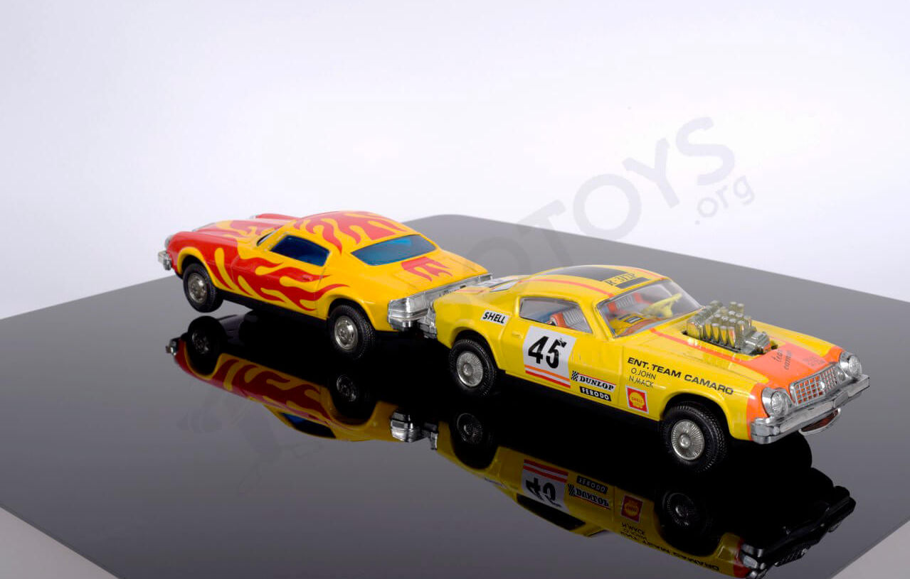Here we have a really cool Camaro from Asahi Toy Company of Japan from the mid-1970s. These are some of the last cars to still use tin car bodies as most other companies had already switched over to all plastic models. As such, and with a few exceptions, these plastic and tin cars are among the "least old" exhibits we have here at MOBOTOYS.