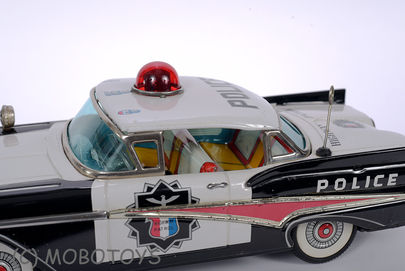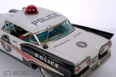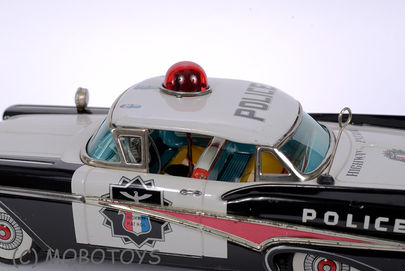 Manufactured by The Bandai company around 1960 this police car is from a period some consider the peak of the "golden age of tin toys", and this particular toy shows why.