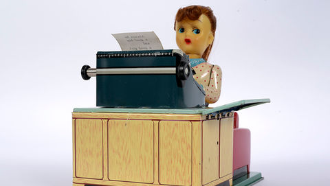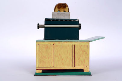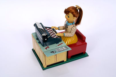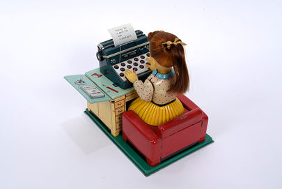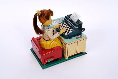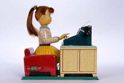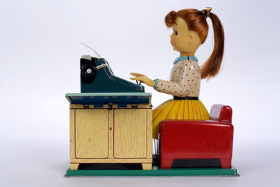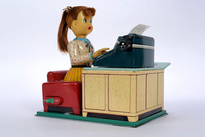 This 1950s Battery Operated Busy Secretary (with lighted and moving keyboard) takes us back life in the 1950s; Drive In Movies, Drive In Burgers, Carnivals and of course toys all take money, and to get money takes a job. Back in these days a typical job would involve being assigned to sit at a desk all day and type on a typewriter with a QWERTY Keyboard (click here for what a QWERTY Keyboard is). What you typed was not important, only that you typed a lot and made click-click-clack noises until your next break. Things are much different today. (editor: No they are not!).